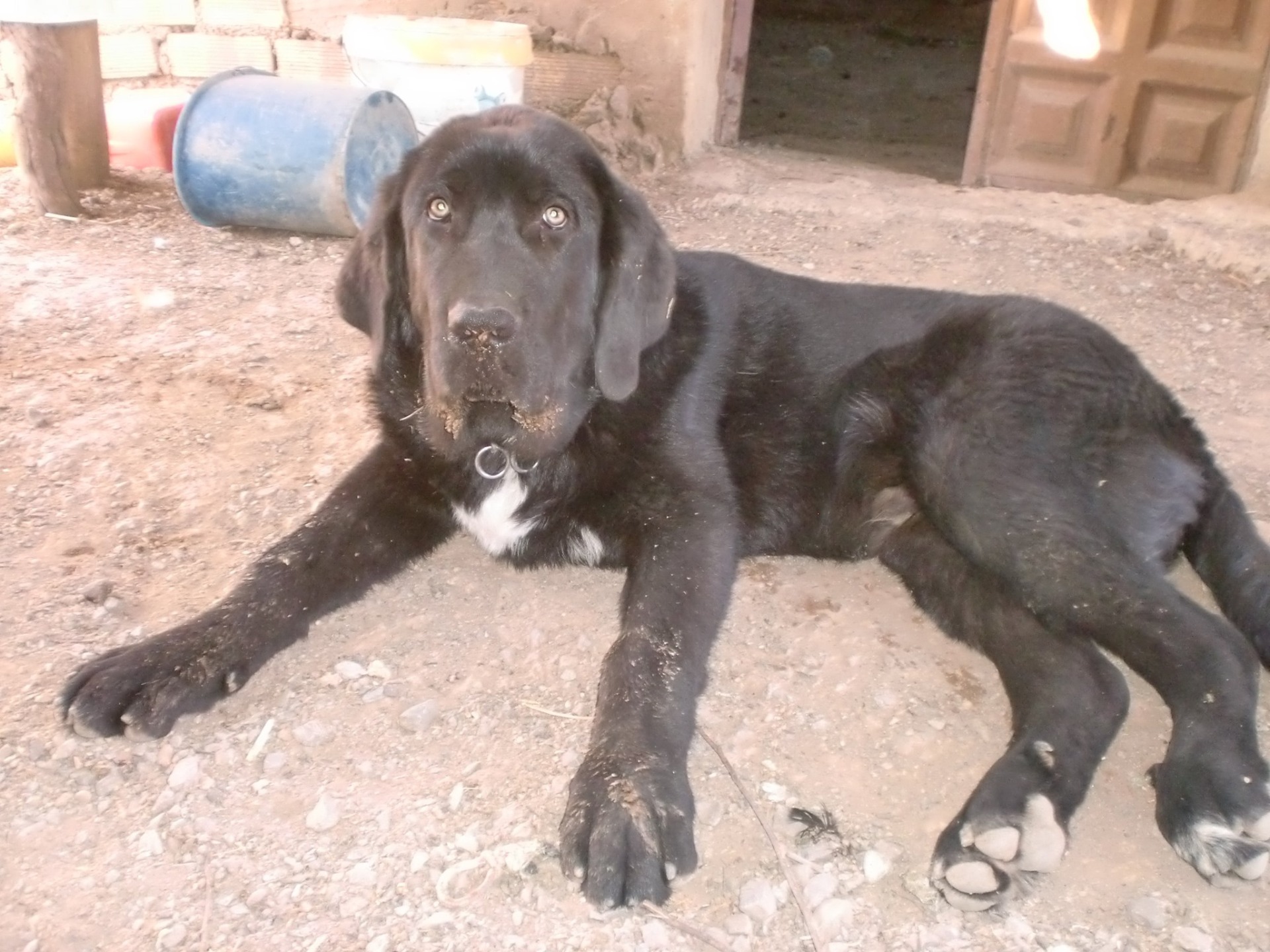 Ocaso cuando llego con cuatro meses despues de haber sido separado de su madre y hacer un largo camino en furgonota y cambios de sitio y gente estaba bastante temeroso ya le tenia preparado una canasta de las que reparten el pan forrada con una caja de carton y por fuera con una protecion de plastico para evitar que se mojase esa noche y la siguiente se la llevo aullando echando de menos a su madre y hermanos al dia siguiente ya salimos de paseo me costo sacarle de su casita y llevarle hasta la calle siempre con su cadena poco a poco fue cogiendo confianza y seguridad a los pocos dias ya fue al campo a conocer su nueva familia cogio como madre adoptiva la madre Talia y Shakira que de momento le vino el instinto maternal y lo acepto de muy buen agrado ya que es muy cariñosa ahora la dobla en tamaño y se pega unas carreras con ella de vez en cuando y me la vuelve loca.